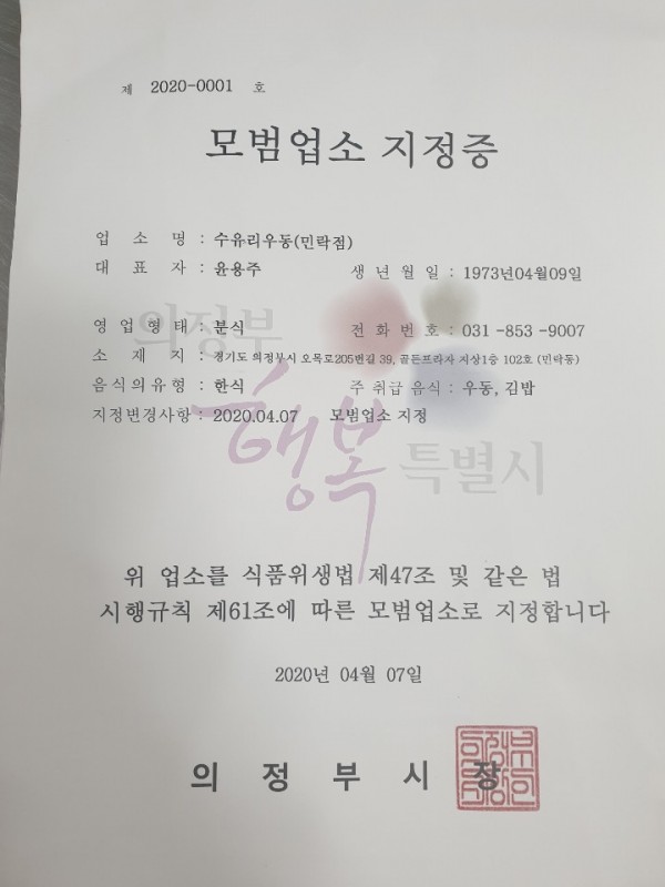 수유리우동집 민락점이 의정부시에서 모범업소로 지정되었음을 알려드립니다.