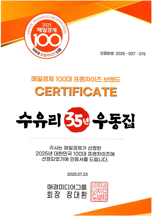 공지 수유리우동집 매일경제 100대 프랜차이즈 선정 2025.07.23