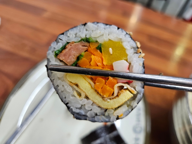 둘째는 사이드 메뉴 경쟁력이다. 수유리우동집의 사이드 메뉴인 김밥은 종류가 적지만 한 번 맛보면 자신도 모르게 단골이 된다. 비결은 밥에 간을 하지 않는 것이다. 밥에 간을 세게 하면 당장은 맛있다고 느끼지만 기억에 남는 뒷맛은 좋지않다. 염도가 높아지는 것도 문제다. 반면 밥에 간을 하지 않고 값비싼 재료를 사용하면 처음에는 모르지만 먹고 나면 또 먹고 싶은 생각이 든다. 그래서 단골이 된다. 고가의 얇은 어묵을 사용하고 당근을 볶아서 사용한다. 참기름은 김표면에만 바른다. 햄이 안들어간 비건 김밥이다.